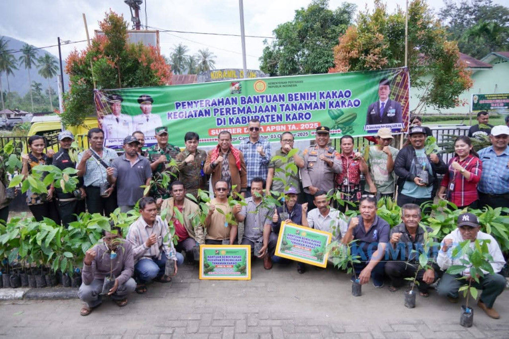 Bupati Karo, Antonius Ginting, menyerahkan secara simbolis bantuan benih kakao kepada kelompok tani penerima di Kabupaten Karo, Jumat (3/10/2025).